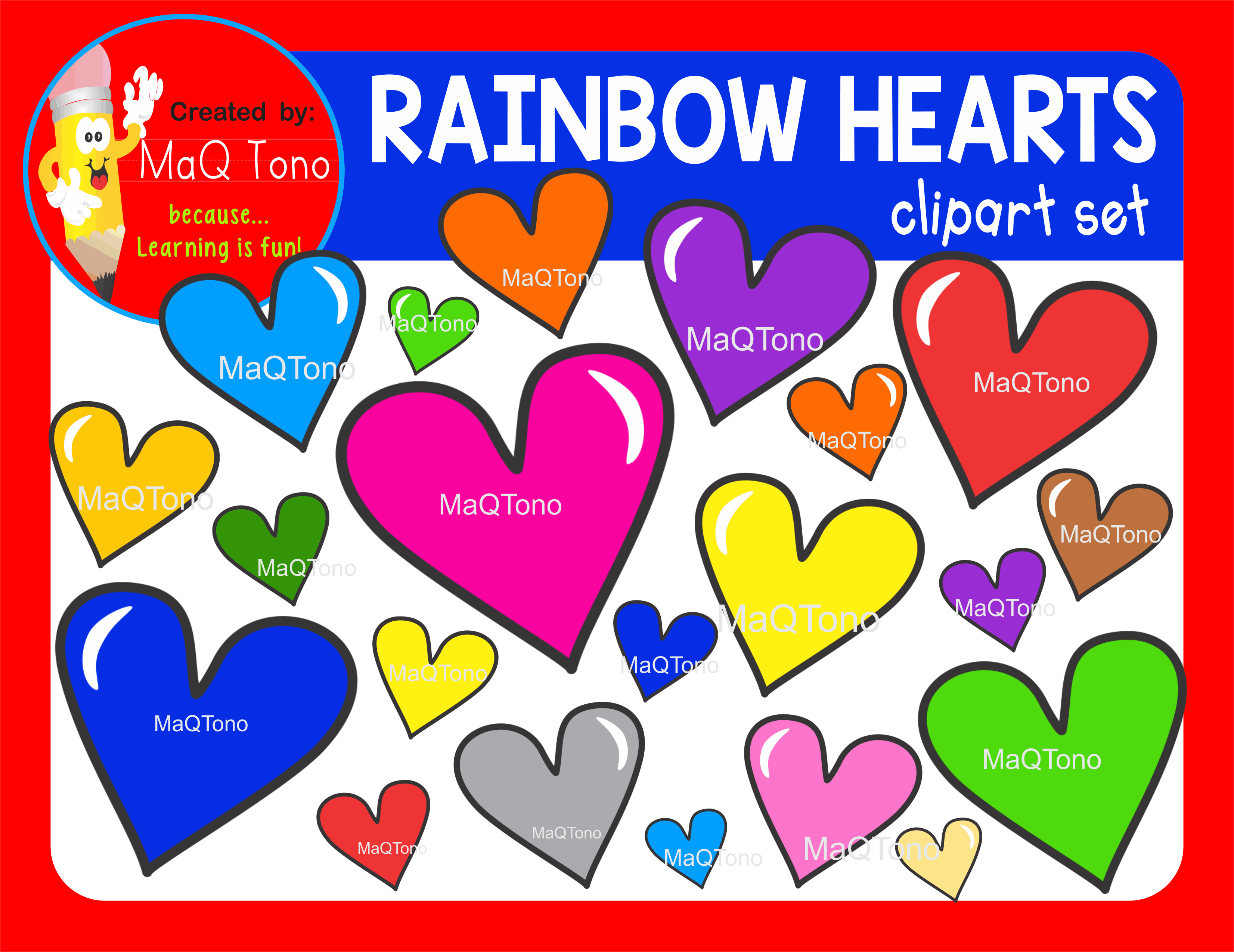 Cute clipart for all classroom decoration ideas , for your classroom projects! A set of colorful rainbow heart. 32 Graphics PNG Format 30 in color, 2 in black and white.